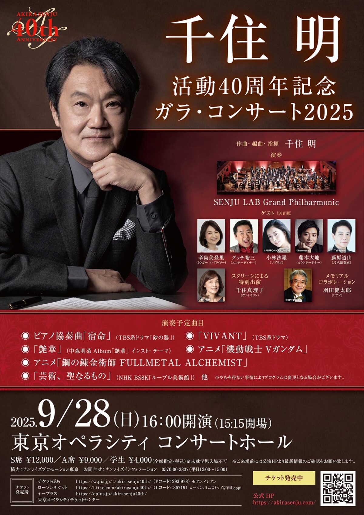 HomeConcert2025年9月28日(日) Concert公演情報 2025年9月28日(日) 会場 東京 東京オペラシティ コンサートホール(スクリーンによる出演) 開演 16:00 共演者 千住 明/SENJU LAB Grand Philharmonic 料金 ¥ 12,000 問い合わせ サンライズインフォメーション 0570-00-3337 詳細HP https://sunrisetokyo.com/detail/29675/ クリックして画像を拡大 CONCERT TOP