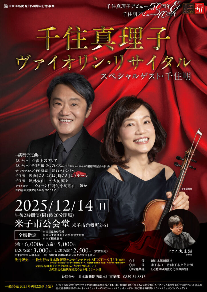HomeConcert2025年12月14日(日) Concert公演情報 2025年12月14日(日) 会場 鳥取 米子市公会堂 開演 14:00 共演者 Pf.丸山 滋、スペシャルゲスト 千住明 曲目 千住 明/こんにちは、母さん メインテーマ 他 料金 ¥6,000 問い合わせ 日本海新聞西部本社事業部 0859-34-8813 クリックして画像を拡大 CONCERT TOP