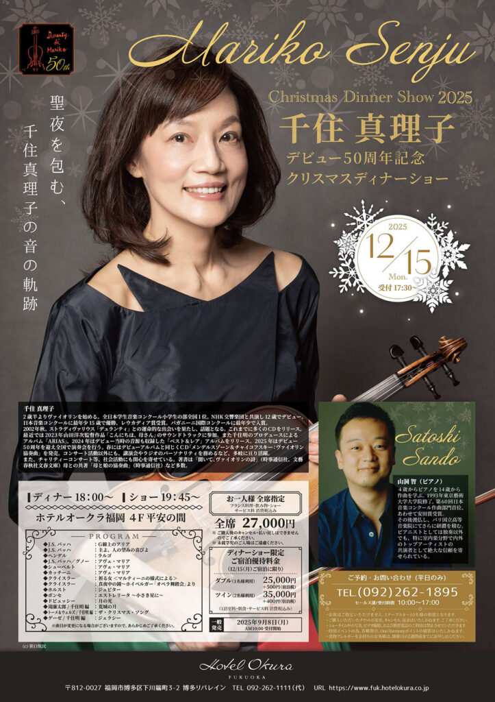 HomeConcert2025年12月15日(月) Concert公演情報 2025年12月15日(月) 会場 福岡 ホテルオークラ福岡 4階平安の間(ディナーショー) 開演 18:00 共演者 Pf.山洞 智 曲目 J.S.バッハ/G線上のアリア 他 料金 ¥27,000 問い合わせ ホテルオークラ福岡 セールス課 092-262-1895 クリックして画像を拡大 CONCERT TOP