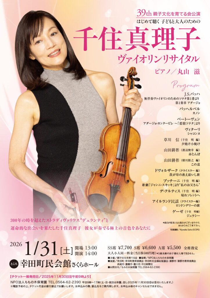 HomeConcert2026年1月31日(土) Concert公演情報 2026年1月31日(土) 会場 愛知 幸田町民会館 さくらホール 開演 14:00 共演者 Pf.丸山 滋 曲目 ヴィターリ/シャコンヌ 他 料金 ¥7,700 問い合わせ ももの木保育園 0564-53-2390 クリックして画像を拡大 CONCERT TOP