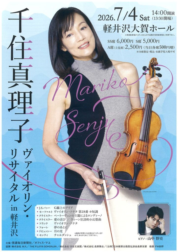 HomeConcert2026年7月4日(土) Concert公演情報 2026年7月4日(土) 会場 長野 軽井沢大賀ホール 開演 14:00 共演者 Pf.山中 惇史 曲目 フランク/ヴァイオリン・ソナタ 他 料金 ¥ 6,000 問い合わせ オフィス・マユ 026-226-1001 クリックして画像を拡大 CONCERT TOP