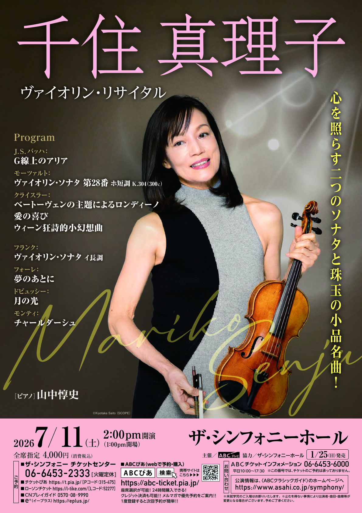 HomeConcert2026年7月11日(土) Concert公演情報 2026年7月11日(土) 会場 大阪 ザ・シンフォニーホール 開演 14:00 共演者 Pf.山中 惇史 曲目 フランク/ヴァイオリン・ソナタ 他 料金 ¥4,000 問い合わせ ザ・シンフォニーチケットセンター 06-6453-2333 クリックして画像を拡大 CONCERT TOP