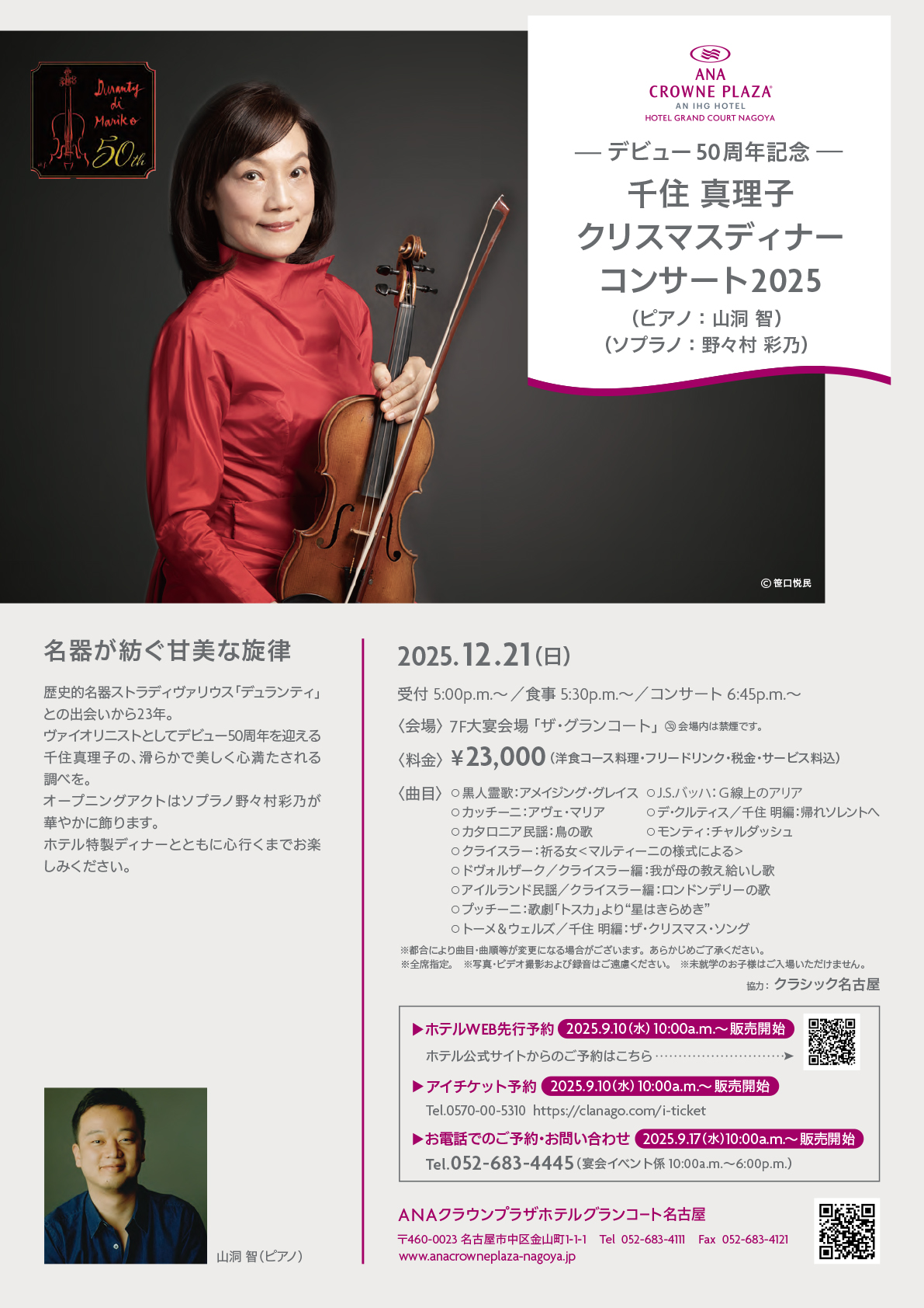 HomeConcert2025年12月 Concert月別公演一覧 2025年12月 2025年12月6日(土) 東京 東京オペラシティ コンサートホール more info 2025年12月8日(月) 京都 ロームシアター ノースホール(12/7 東京発着の旅行) more info 2025年12月14日(日) 鳥取 米子市公会堂 more info 2025年12月15日(月) 福岡 ホテルオークラ福岡 4階平安の間(ディナーショー) more info 2025年12月20日(土) 佐賀 鳥栖市民文化会館 more info 2025年12月21日(日) 愛知 ANAクラウンプラザホテルグランコート名古屋7階大宴会場「ザ・グランコート」 more info 2025年12月25日(木) 神奈川 横浜みなとみらいホール more info 2025年12月27日(土) 静岡 MOA美術館 能楽堂 more info
